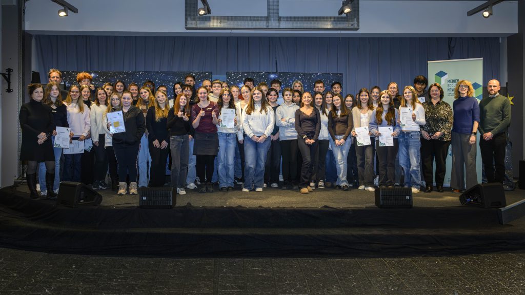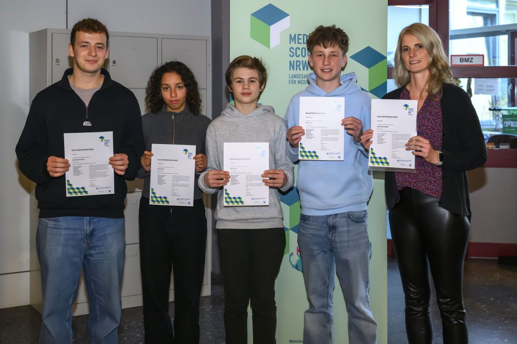 Im Rahmen einer feierlichen Zertifikatsübergabe wurden 35 Schülerinnen und Schüler sowie 18 Lehrkräfte aus dem Rhein-Kreis Neuss zu Medienscouts und Beratungsfachkräften ernannt. Die Abschlussveranstaltung der 5-teiligen Medienscouts-Ausbildung fand im Forum der Städtischen Maria-Montessori-Gesamtschule in Meerbusch statt. Erstmals nahmen an der Qualifizierung auch zwei Förderschulen teil, wodurch das Projekt einen weiteren Schritt zur inklusiven Medienkompetenz im Rhein-Kreis Neuss geht.