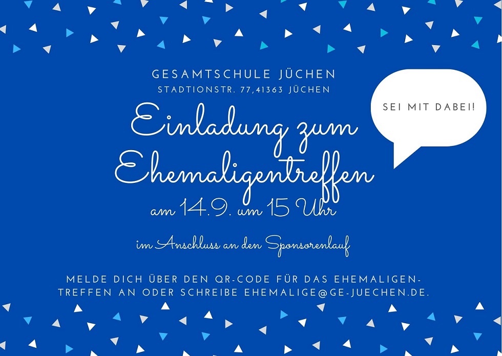 schon ein Jahr ist es her, dass sich ehemalige Schüler*innen und Lehrkräfte der Gesamtschule Jüchen im Schulgebäude getroffen und in Erinnerungen geschwelgt haben – jetzt steht ein weiteres Treffen an. Die Gesamtschule Jüchen lädt alle ehemaligen Schüler*innen und Lehrkräfte recht herzlich zu unserem zweiten Ehemaligentreff am Samstag, den 14.09.2024, ein. Es geht um 15 Uhr nach dem Sponsored Walk los.