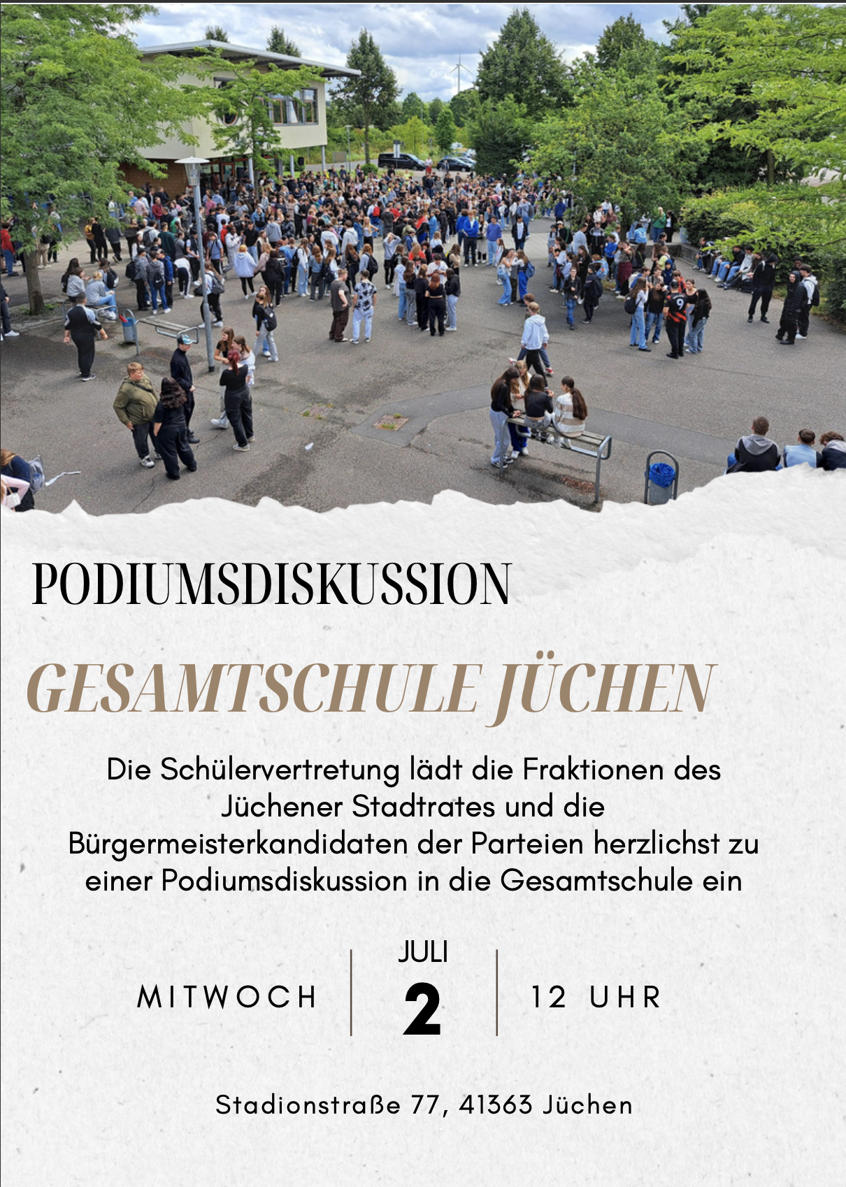 Die Schülervertretung lädt die Fraktionen des Jüchener Stadtrates und die Bürgermeisterkandidaten der Parteien herzlichst zu einer Podiumsdiskussion in die Gesamtschule ein.
