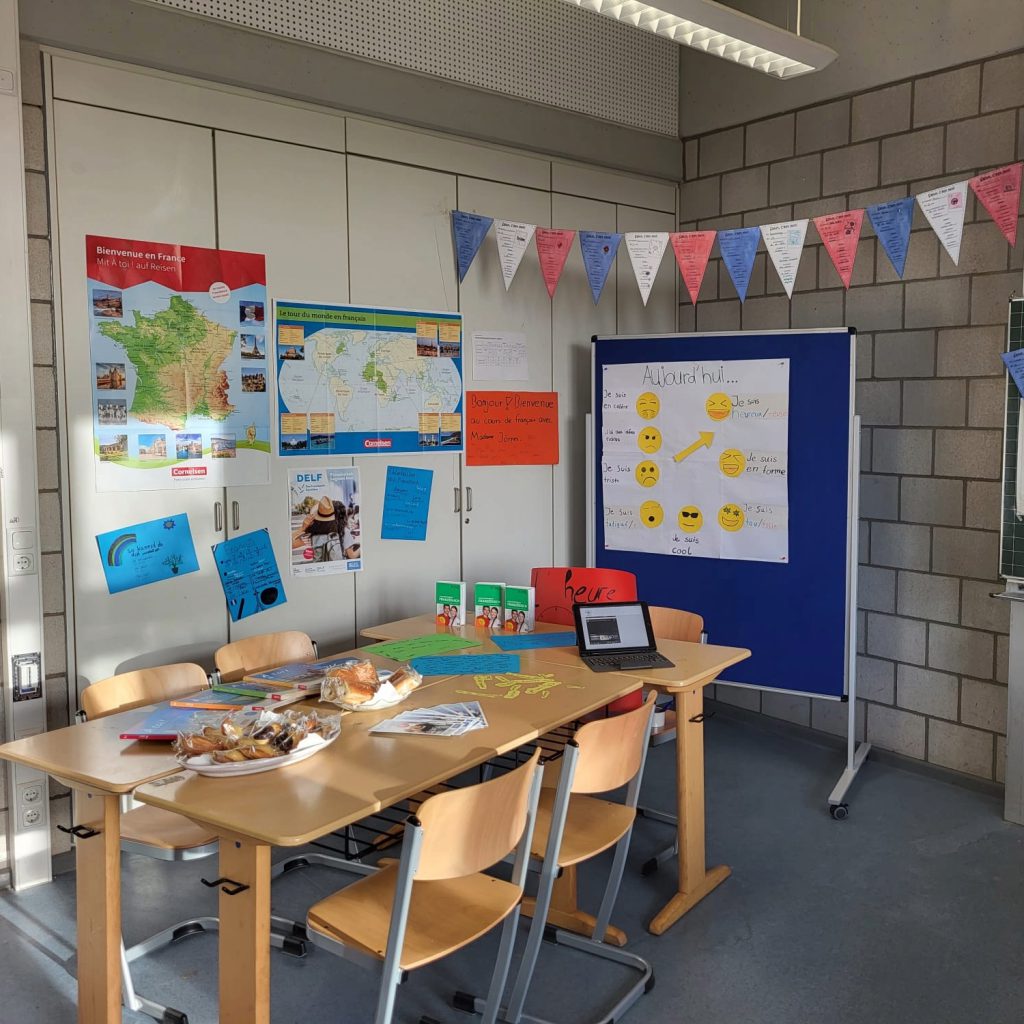 Bei uns lernen unsere Schüler und Schülerinnen in der Sekundarstufe I Französisch im Wahlpflichtbereich von Jahrgang 7 bis Jahrgang 10. In den Jahrgängen 7, 8 und 9 unterrichten wir Französisch 4-stündig, in Jahrgang 10 2-stündig. Wir arbeiten mit dem Lehrwerk „A toi!“ vom Cornelsen-Verlag. Ausgehend von Alltagssituationen zu Themen wie Familie, Schule und Freizeitgestaltung bis hin zur reflektierten Auseinandersetzung mit literarischen, aber auch gesellschaftspolitischen oder landeskundlichen Themen erwerben unsere Schülerinnen und Schüler im Laufe der Zeit durch ein zunehmend differenziertes Repertoire an sprachlichen Mitteln interkulturelle Handlungsfähigkeit. Dies bedeutet, dass im Unterricht neben der Arbeit mit dem Lehrwerk von Anfang an in altersgemäßer Progression und Themenauswahl auch authentische Texte behandelt werden. Dabei kann es sich um Sachtexte und literarische Texte handeln, aber auch um Liedtexte oder um Auszüge aus aktuellen französischen Filmen.